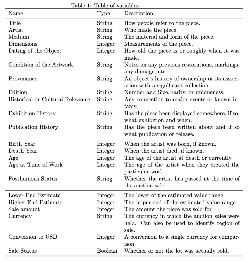We added additional variables to ensure the dataset is robust enough to handle various cross-sectional explorations into what variables inform art analysis. Our additional variables fall primarily into information about the artist and transaction details. Table 1 outlines the variables in detail from the various groupings.