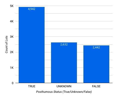 We selected a subset of the overall dataset for the case study in section 4. The verified data contains 10,016 individual auction lots. These auction lots represented 4,329 individual artists, with an average age of 77.22 years. The average age of the artists when creating their art pieces was approximately 48.53 years. The artworks ranged from early historical pieces estimated from 1200 B.C.E. to contemporary art made in 2021. As a result of this distribution of historical to modern artwork, a handful of artists were unknown or craftspeople whose names have been lost to history. Therefore, while there was data regarding the artwork and financial details of the auction, there was limited information regarding the artist’s details. Figure 1 shows the distribution of posthumous to living and unknown artists.
