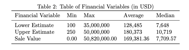 In addition to details regarding the artists, we included information about the various financial variables in the dataset. Table 2 shows the breakdown of minimum, maximum, average, and median values for the converted financial values in USD. Notably, we have the difference between the average and median sale value caused by high-value auction items that pulled the average well above. Furthermore, approximately 20 percent of the auctions did not result in a sale, which led to sale values of 0.00 USD, which we can explore in future work as missing data through a variation of Heckit models.[30]
