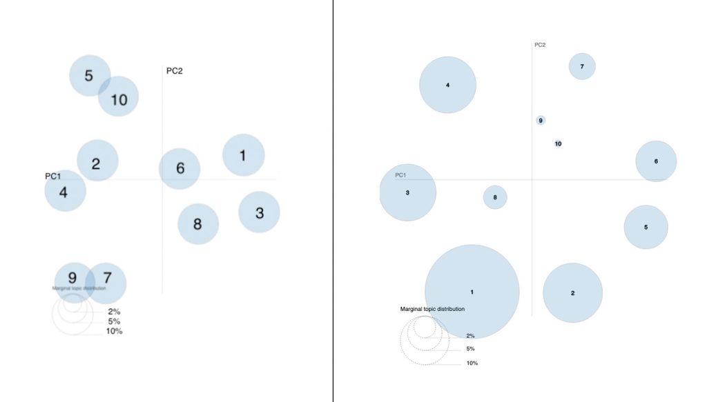 We begin our comparison with the baseline by examining the distribution of ten topics on the pyLDAvis plot. Figure 2 displays our ten-topic distribution alongside the results from Abera Yilma et al. Our model shows distinct separation between topics, with no overlapping groups. The topics are distributed across the chart without excessive clustering, demonstrating that the model interprets the artworks in each topic distinctly, with clear separations reflected in the unique language used to describe them.