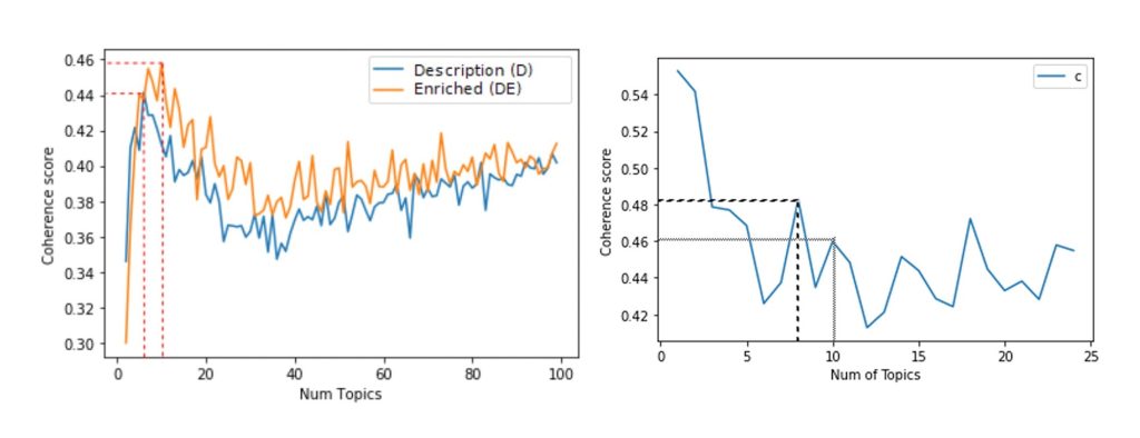 Having outlined AppraiSet, we now present a case study exemplifying the dataset’s usability while demonstrating how an algorithm may process aesthetic language. For this example, we use an LDA topic model. Abera Yilma et al. define an LDA model as a tool for drawing abstract topics from an extensive collection of text data to explore the less obvious subject matter contained within the data.[31] In other words, latent dirichlet allocation (LDA) models are algorithms that classify data points into “topics” based on the patterns of associated words and phrases in the text. Using this model, we explore exactly how an algorithm may develop its classification of artworks using the language of art experts. Previous work on LDA models and art have handled smaller datasets without the language of aesthetics. Therefore, this will be an early step in exploring how an algorithm may process aesthetics on its own. The remainder of this section details how we established and evaluated our LDA model using the training set of AppraiSet.