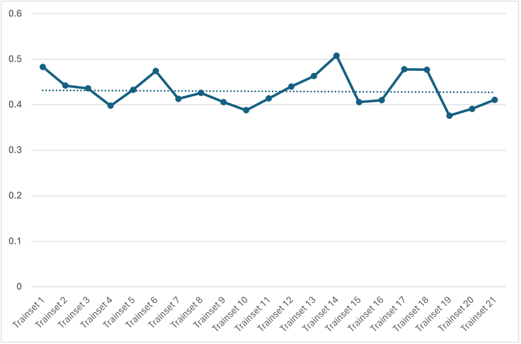 For the initial model, we pre-selected ten distinct topics. At this level, our model’s coherence value is comparable to that in Abera Yilma et al.’s plot, around 0.46 (Figure 3). However, when running the model with eight topics, our coherence value increases slightly to over 0.48. Moreover, our coherence values remain consistently higher even when the number of topics is increased to as many as twenty-five. We repeated this analysis with different splits of the dataset to ensure that the coherence of topics remained stable regardless of how the training and test data were divided. The coherence values for eight topics across different test splits are shown in Figure 4, with values ranging from 0.376 to 0.508, consistently outperforming the baseline on average.