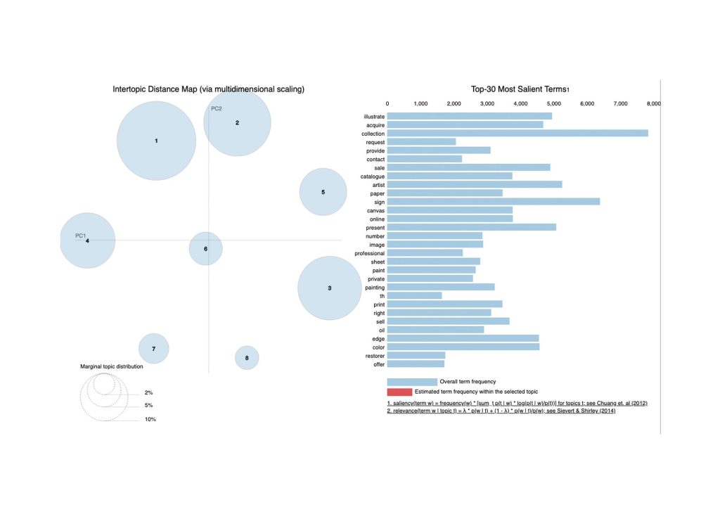 We built our LDA model using the AppraiSet training data subset of 8,506 artworks. Since this paper focuses on exhibiting how an AI may develop its own aesthetic associations, we had to drop some of the columns to trim down to only the core qualitative text data points. The final variables we included were the title, artist name, medium/materials, condition, provenance, edition, historical or cultural relevance, exhibition history, publication history, and currency. For the model to efficiently process all the text contained within these different variable categories, we concatenated all of the text into one large text document for each work. While cleaning the data, our previous concatenation accelerated our task of creating one “all attributes” section within the dataset. With the data for each auction lot consolidated as a single text document, we could perform the proper pre-processing. This pre-processing involved setting up custom stop words such as auction, lot, condition, and report, among others. Stop words are specific words that are so universal in a dataset that their inclusion in a text description of an artwork likely will not help differentiate it from any other artwork data points.[32] We highlighted our unique stop words in the pre-processing stage. We also removed punctuation, established bigrams and trigrams, and lemmatized and ensured the text was all lowercase before developing the model using the popular gensim library.[33]