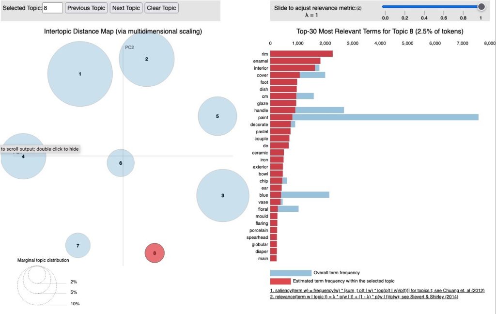 When analyzing the text associated with the topic model, we observed how differently AI interprets aesthetic language. Figure 5 displays the thirty most salient words from the dataset that contributed to the creation of the eight topics. These terms help the model understand aesthetic language and categorize the artworks. Table 3 presents the top three words relevant to each topic. For example, in Topic 8, which includes words used to describe East Asian porcelain pieces (Figure 6), we can see how the relevant terms provide insight into the type of aesthetics represented in that topic. Similar approaches have been used by other researchers exploring aesthetic language used on the Internet.[41] The broader implications of this model for the field of aesthetics are discussed in section 5.