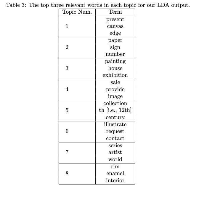 Our analysis indicated that our model did not specifically identify any particular type of artist or price range. Future research is needed to explore what patterns may arise from the different topics related to art made by different demographics. The ethical implications here are that if a bad actor were to use topics associated with a more “desirable” aesthetic, they might want to rewrite the descriptions of the artwork. Another important ethical consideration is the demographic makeup of each topic group to ensure that no one group is disproportionately included or excluded by the aesthetic language used. Understanding which economic or demographic groups are associated with each topic cluster would necessitate additional data. The need for more data raises ethical questions about collecting additional data to ensure the current data is free from hidden biases or trends. However, the debate about this question is beyond the scope of this paper.