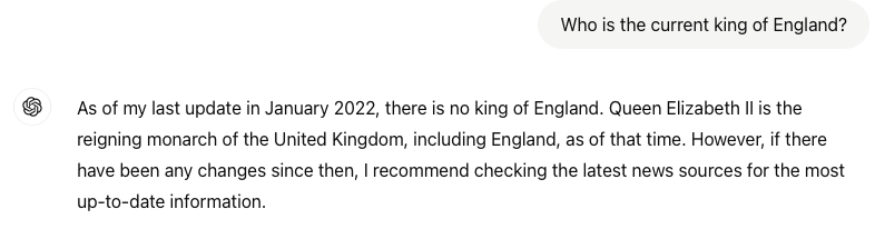 As we will recall, GPT stands for “generative pretrained transformer.” Being “pretrained” means the model’s weights (parameter tensors) are fixed after initial training. As of April 2024, the datasets for the most widely used models are at least a year old; for instance, GPT-3 was trained on data up to January 2022, and Claude 2 used data available up until April 2023. We can therefore describe LLMs as inherently static language models.