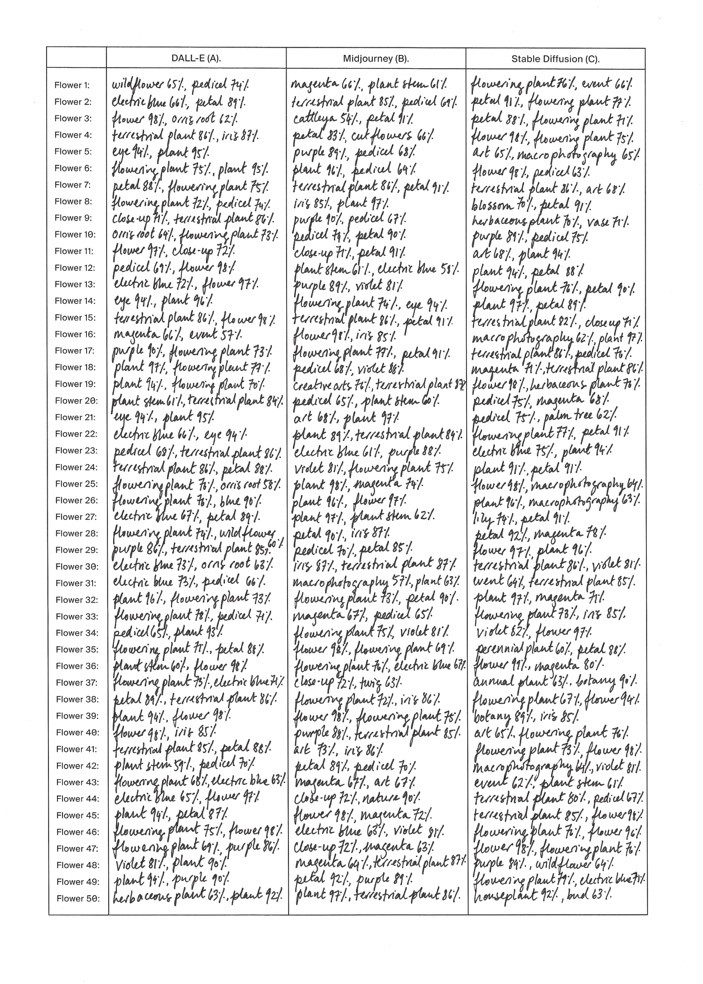 Despite being a relatively new technology, GPTs have already made their presence felt in the world of art. Anna Ridler’s Synthetic Iris Dataset (2023) is a prime example of how GPT principles can be used to create thought-provoking works of art. By generating 150 unique flowers and pairing them with interpretations offered by a computer vision API, Ridler was able to reveal cultural and technological codes that would have otherwise gone unnoticed. Drawing inspiration from Ronald Fisher’s dataset, Ridler employed language to uncover hidden meanings in words like ‘iris’ and ‘violet’ that can refer to both flowers and colors. This showcases how GPT technology can be used to bring a new, previously unachievable level of complexity and richness to art.